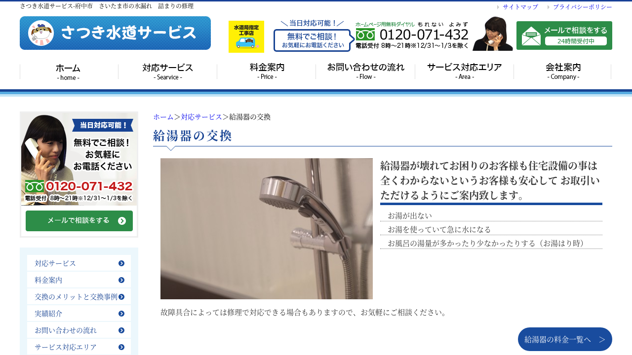 さつき水道サービスは、東京都府中市、埼玉県さいたま市を中心に、給湯器の交換や修理を専門に行っている会社です。