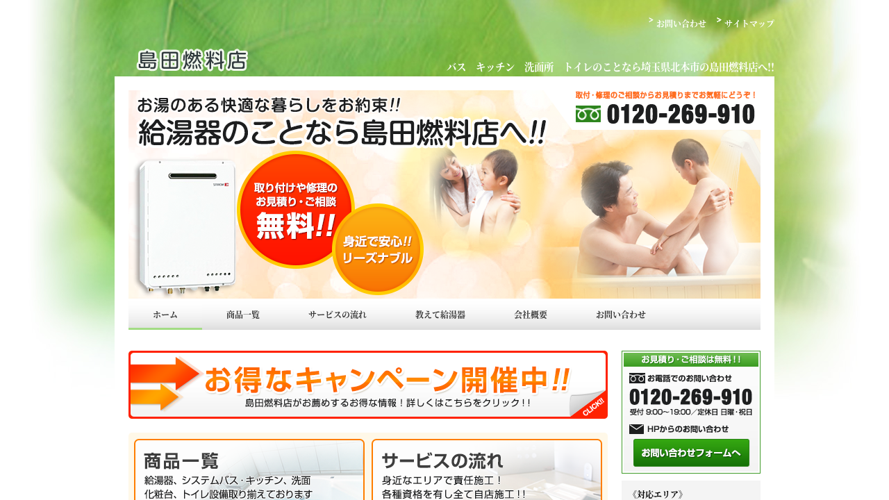 埼玉県北本市に拠点を置く、給湯器のことなら何でもお任せできる島田燃料店は、お客様の快適な暮らしをサポートする給湯器のプロフェッショナルです。