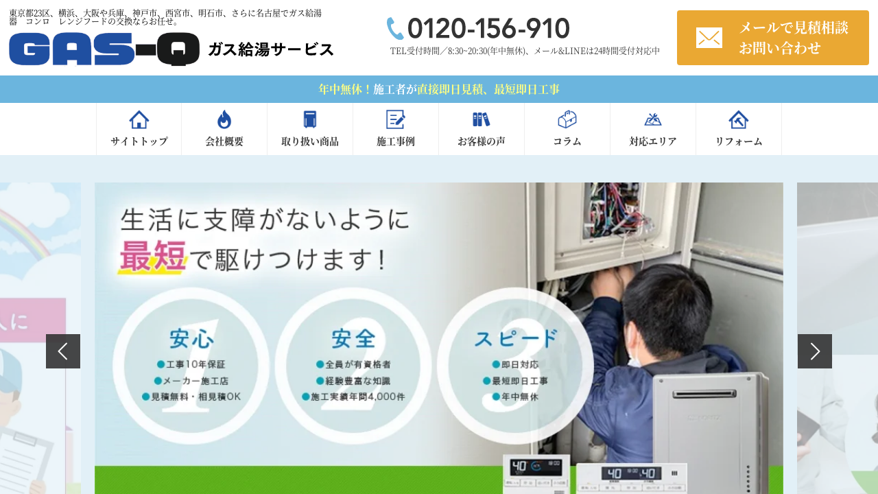 ガス給湯サービス西宮店(GAS-Q)は、兵庫県西宮市を中心に、ガス給湯器の設置・交換を専門とする業者です。